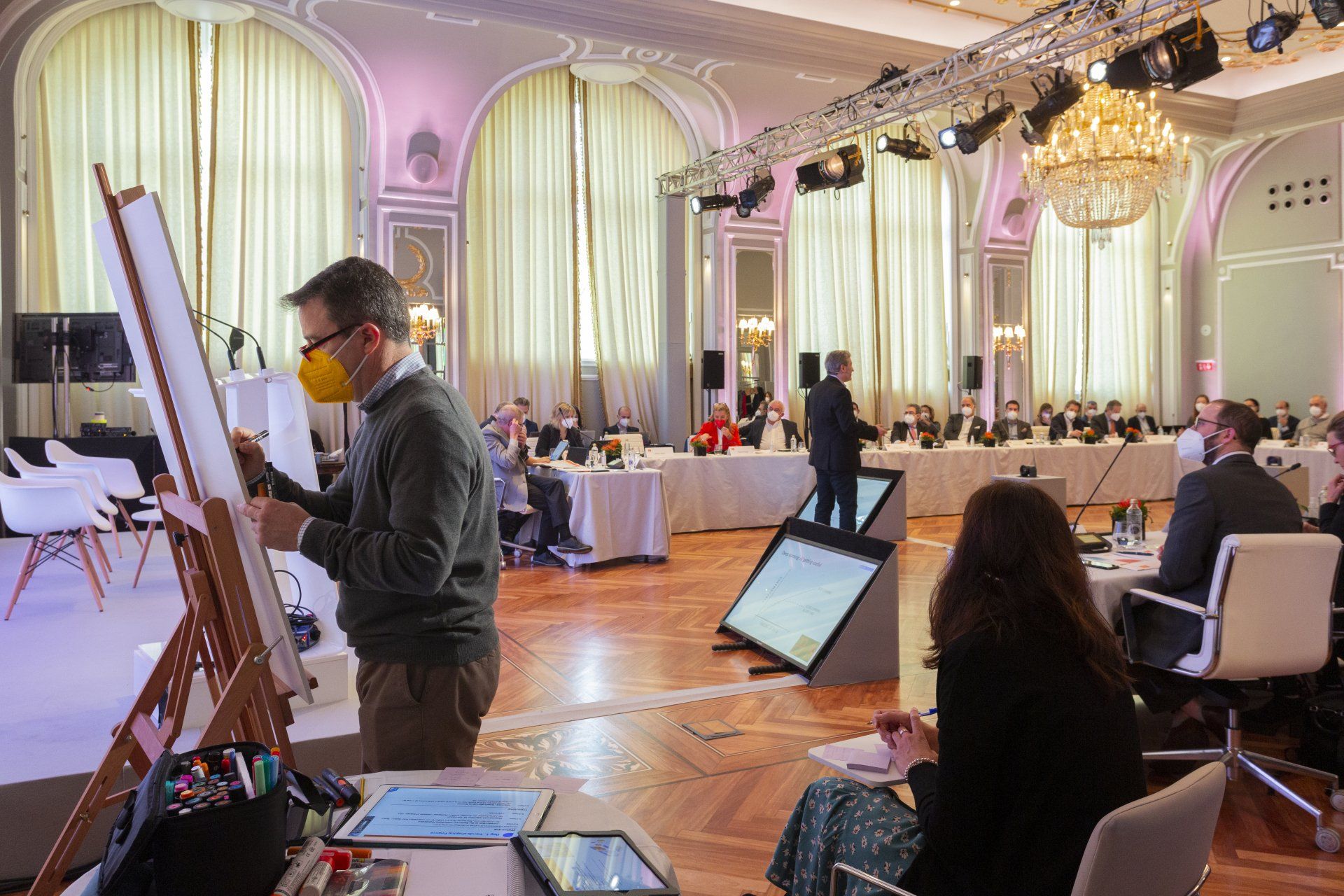 Nos conectamos a la reunión virtual desde nuestras oficinas y creamos el graphic recording de tu evento en directo de forma online.