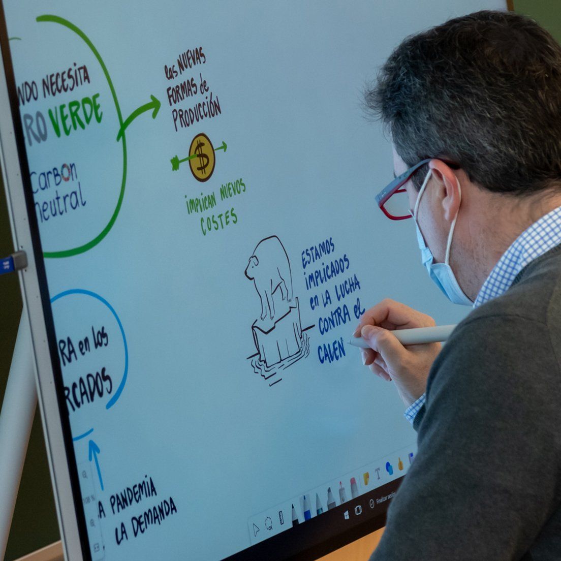 Hace más de 10 que dibujamos en directo. Desde entonces han ido apareciendo una gran cantidad de materiales y técnicas nuevas que hemos incorporado en nuestra labor de facilitadores visuales . Al principio empezamos realizando apuntes en hojas de papel de mediano tamaño, con lápices y rotuladores profesionales de secado rápido que permiten mezclar distintas tintas de forma suave y uniforme. Destacamos los Neuland como los primeros rotuladores especialmente diseñados para el graphic recording. No tardamos en dar el paso a formatos más grandes y empezamos a dibujar sobre murales de cartón pluma. Con el aumento en los dibujos y en los textos el calibre de los rotuladores tuvo que adaptarse. Inicialmente tenían entre uno y tres centímetros de grosor, pero progresó hasta siete, casi más una brocha que un rotulador. Los paneles más grandes incentivaron las retransmisiones en directo, proyectando en pantalla todo aquello que dibujábamos. Poco a poco cobrábamos más relevancia en las reuniones y la experiencia de los eventos se enriquecía con ello. Pronto vino una gran revolución: las tablet , y con ellas los lápices stylus . Inicialmente eran de punta de burbuja de goma, pero más adelante aparecieron los Ipen o Surface pen , instrumentos cada vez más precisos y orientados al software de dibujo. En los primeros tiempos esta tecnología tenía un incómodo retardo (conocido como “latencia del trazado”) que afortunadamente ya se ha superado. El trabajo con soporte digital tiene muchas ventajas: permite correcciones inmediatas, aplicar el color mediante paletas infinitas o ampliar un espacio de trabajo cuando necesitas ser más preciso. Por otra parte, las tablet han hecho posible dibujar en remoto durante los periodos de distancia social y han sido las grandes protagonistas de los eventos online por la conectividad y adecuación a las plataformas de video-llamada. Gracias a estos dispositivos podemos ilustrar conferencias desde el otro lado del globo y la distancia no es un inconveniente para trabajar en equipo. Hoy en día los facilitadores visuales podemos disfrutar de hardware más sofisticado con pantallas cada vez más grandes, como el modelo de Microsoft Surface Hub 2S de 50” o de 85” que hemos podido probar recientemente en uno de nuestros eventos. Sus dimensiones permiten el lucimiento del acto de dibujar en directo sobre un escenario y su conectividad digital lo convierte en una solución perfecta para eventos híbridos o bimodales. Nuestra inquietud por conocer todo tipo de herramientas para el dibujo nos ha dado la oportunidad de probar sistemas virtuales como Oculus , el Graffiti de luz de Cubensis y otras aplicaciones de técnica combinada como Mural Maker by DaVinci Eye , entre otras. Estamos convencidos que en un futuro próximo el Metaverso contará sin duda con interfaces y medios de producción y creación visual muy avanzados. La evolución de las técnicas relacionadas con el graphic recording va a continuar en estos entornos en los que será necesario generar contenidos visuales de un modo inmediato. La tecnología crece imparable a nuestro alrededor y sin duda ofrece herramientas muy interesantes. Desde Dibujario recomendamos caminar entre todos estos mundos : analógico, digital, real y virtual. El verdadero potencial está en ser lo más versátil posible y tener capacidad de adaptación. Como decía un buen maestro: “ Dibuja siempre, dibuja con lo que sea ”.